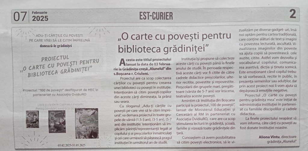 Proiectul: „O carte cu povești pentru biblioteca grădiniței”